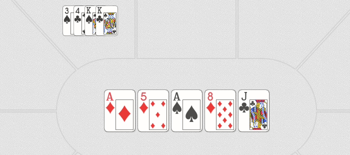 Пример 1: Составлено Туз,3,4,5,8 и Две пары на Тузах и Королях. Туз использован в обоих видах раскладов.